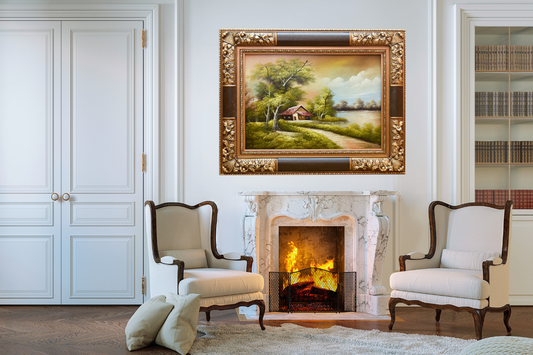 لوحة زيتية مستوحاة من الطبيعة في كوخ على ضفة النهر ذات سحر ريفي
